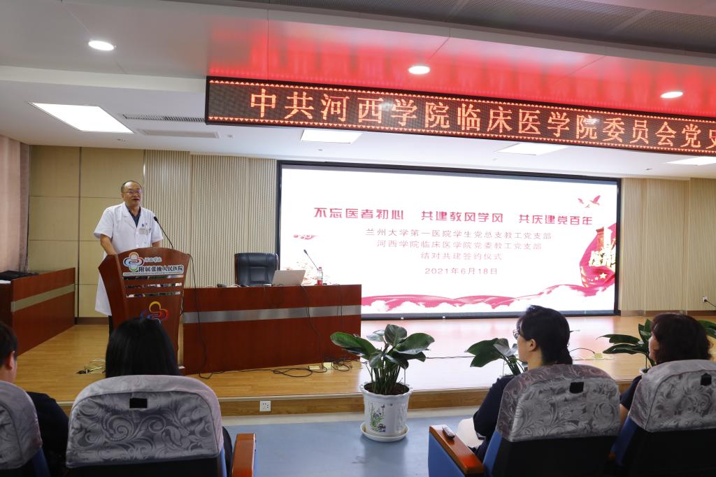 为迎接建党百年,深入学习习近平新时代中国特色社会主义思想,全面贯彻落实党的十九大和十九届二中、三中、四中、五中全会精神,落实新时代党的卫生与健康工作方针,不断巩固深化“不忘初心、牢记使命”主题教育成果,创新基层党建工作载体、提高基层党建工作水平。2021年6月18日,临床医公司党委教工党支部与兰州大学第一医院员工党总支教工党支部结对共建,进行了以“不忘医者初心,共建教风学风,同庆建党百年”为主题的共建签约仪式。william威廉英国官网领导班子成员、教工党支部书记、各教研室主任、教师员工代表及兰大一院副经理、教工党支部书记一行,150多人共同参加了活动。