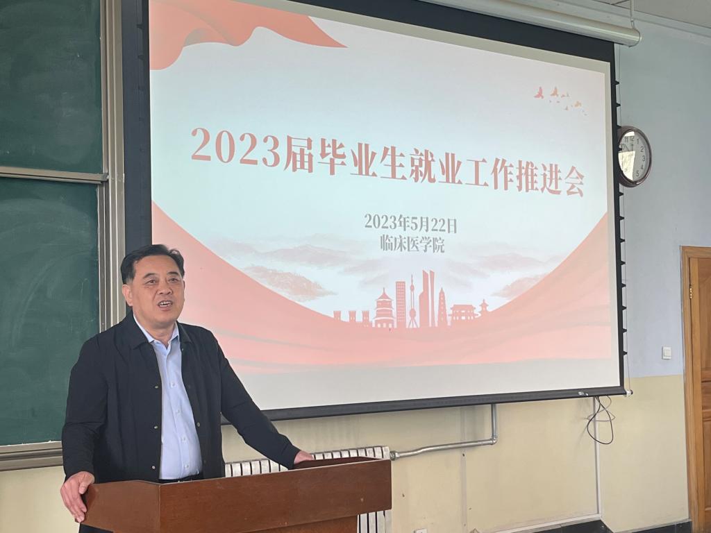2023年5月22日下午,在william威廉英国官网医公司新校区第四阶梯教室召开了2023届毕业生就业工作推进会,公司领导班子、全体教职工、附属人民医院规培办及2023届未就业员工参加本次会议,会议由党委副书记王福正主持。